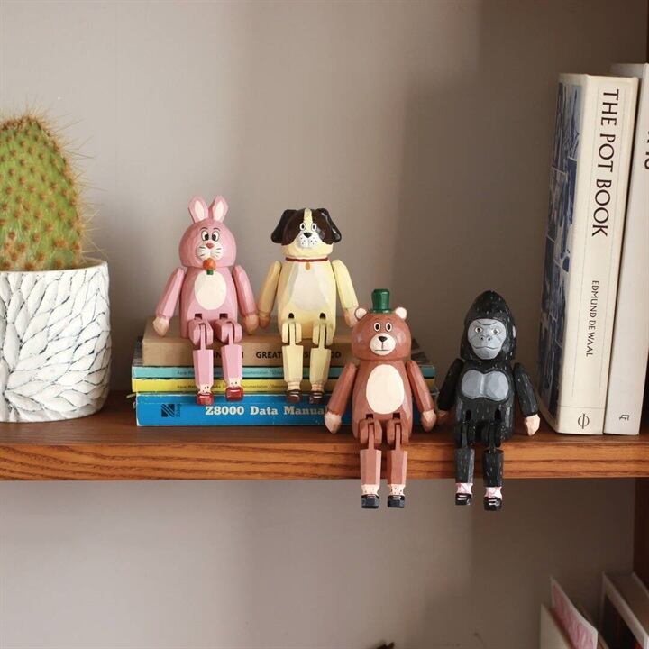 天然木のボディは可動式なので、棚やテーブルなど、シーンに合わせた座り方でディスプレイすることができます。